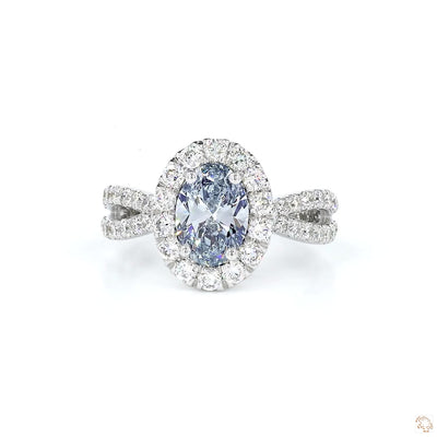 This engagement ring presents a fancy intense blue oval Diamond, surrounded by a halo and a split-shank band pavé-set with Brilliant round diamonds. With its combination of a distinct center stone, diamond accents, and clean lines, this ring blends modern styling with classic touches for a refined, contemporary engagement piece.