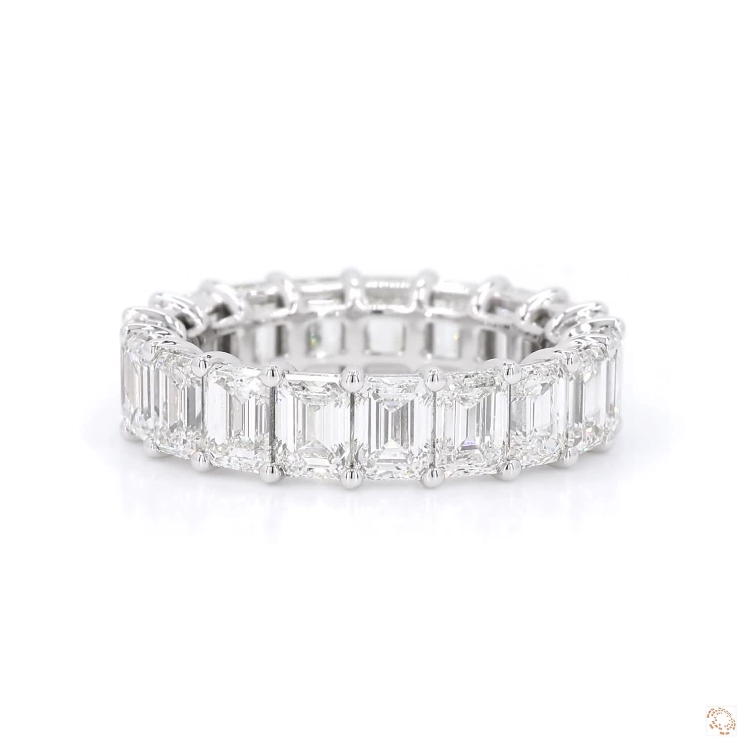 A Emerald Shaped Lab-Grown Diamond Eternity wedding band featuring emerald-cut lab-grown diamonds meticulously set in a prong setting. Crafted in 18K white gold, this diamond ring exudes refined elegance and make a thoughtful gift for anniversaries, birthdays, or weddings.