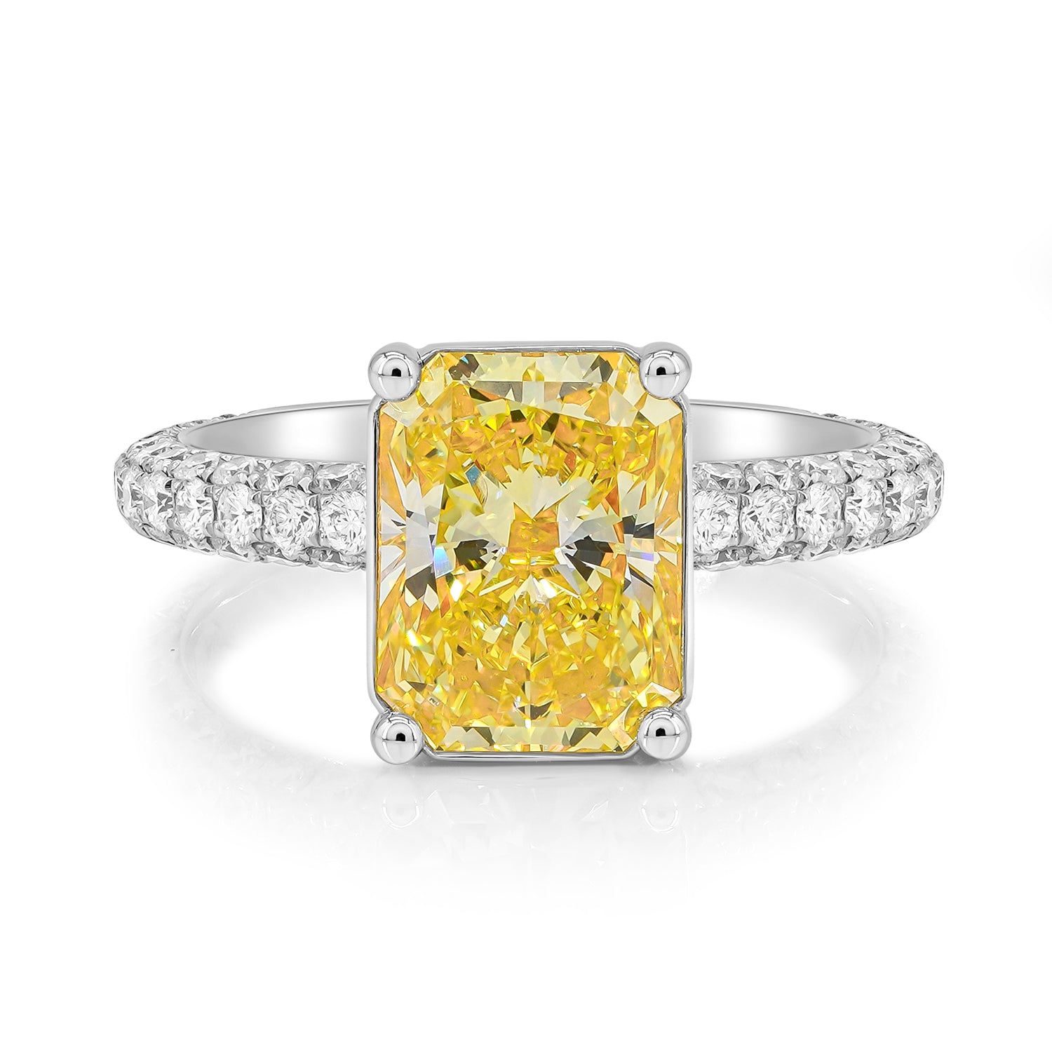 This Yellow diamond engagement ring features a radiant cut fancy yellow diamond at its center, surrounded by a 3/4 Pave Cathedral setting. The delicate design and subtle sparkle of the micro pave setting complement the central stone, creating a sophisticated and elegant look. This ring is a beautiful choice for those who appreciate understated luxury and timeless style.