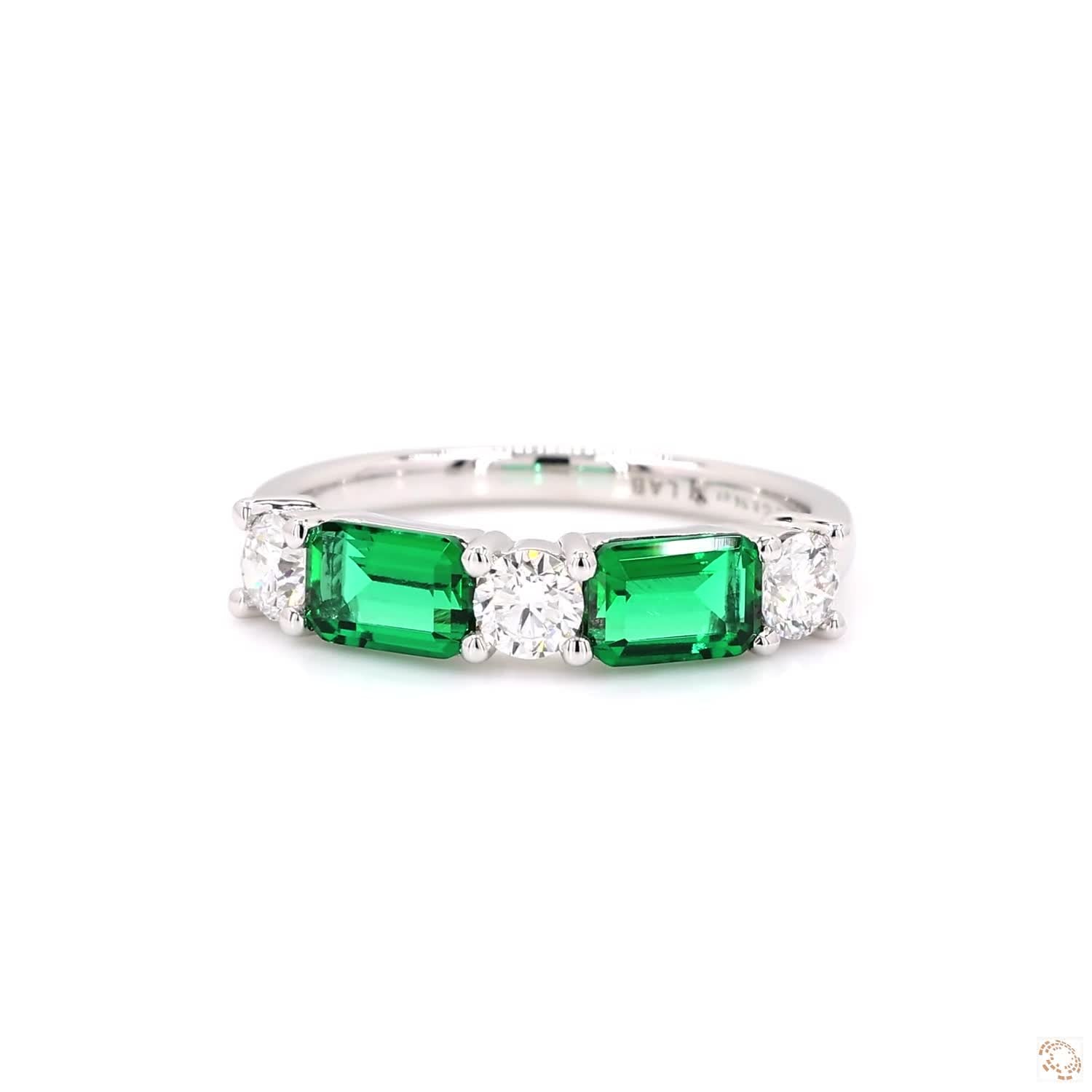 Crafted with two emerald cut Green Lab Emerald and Round Lab Diamond in 18K White Gold, this sleek design will make for a perfect gift. This elegant lab emerald and lab diamond ring offers timeless appeals and makes the perfect elegant gift for any occasions and this elegant emerald and diamond ring. This rings comes for immediate delivery in a US 6 size. Please allow 1-3 business days for our jewelers to adjust the ring to other sizes offered