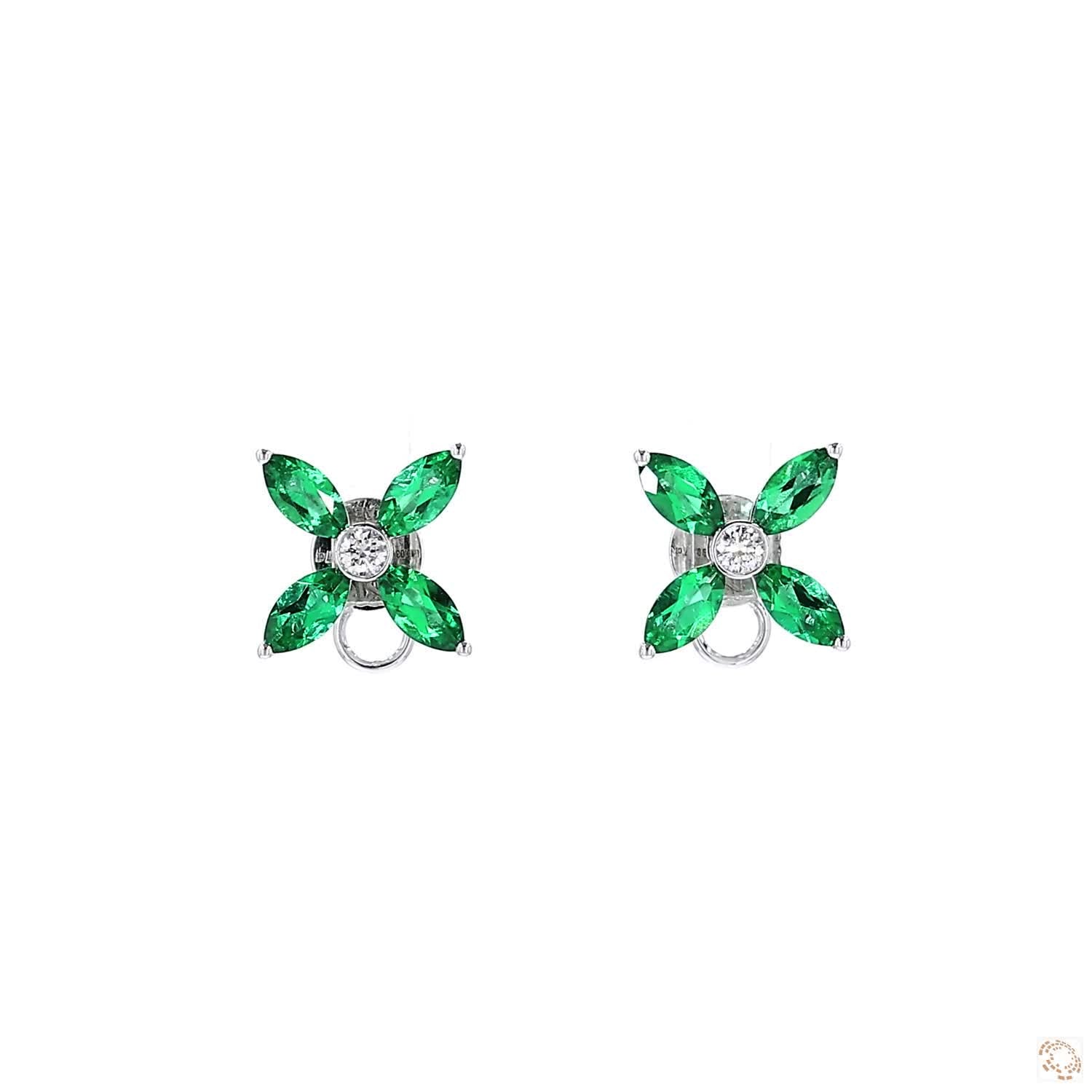 A pair of Green Emerald Stud Earring in 18k White gold paved with a Round Diamond it its center. These beautiful earrings feature 4 lab grown Marquise Shape green emeralds of 0.93 total carat weight. Perfect for both special occasions and everyday elegance, this pair of lab-grown emerald earrings are a great touch of elegance to any look.