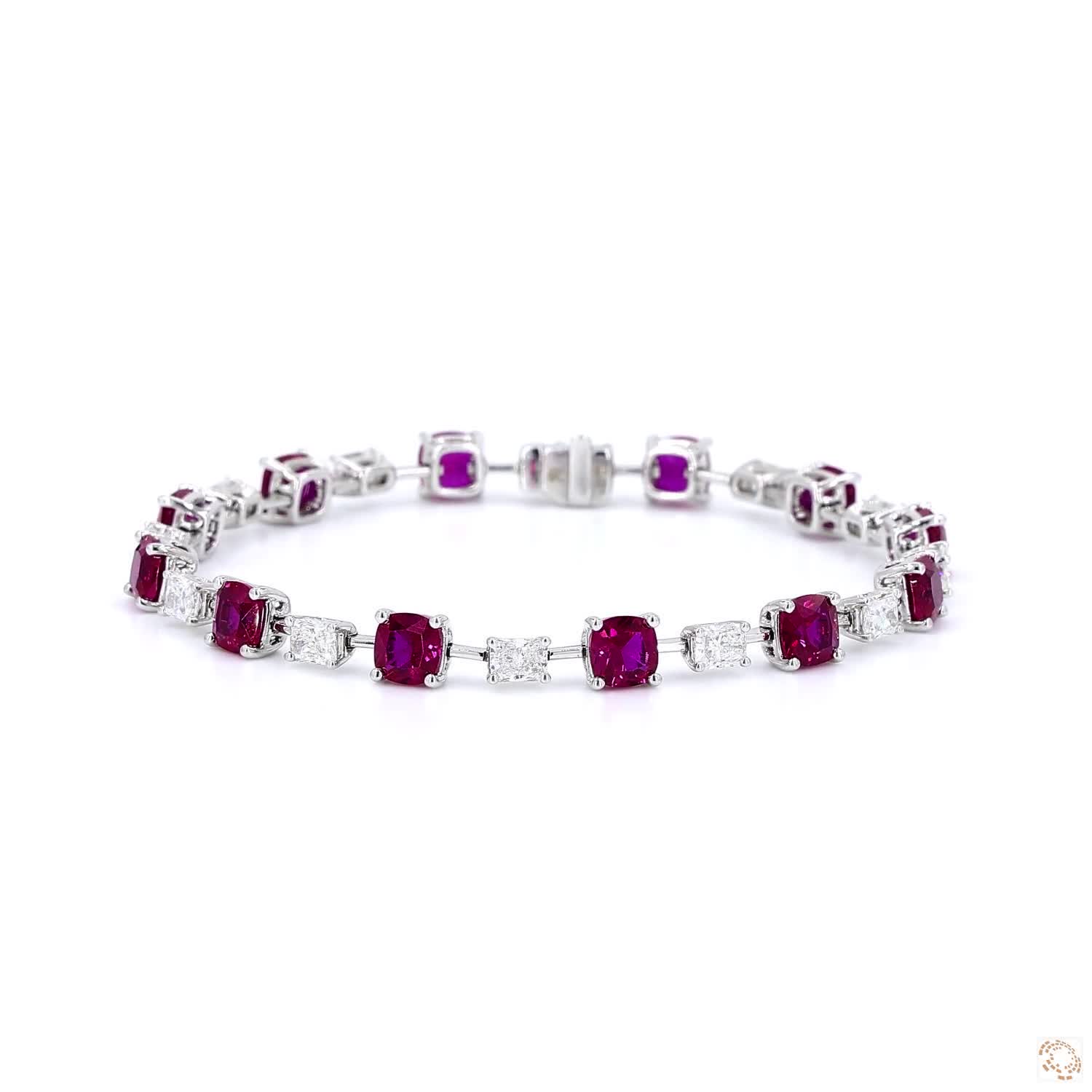This exquisite bracelet pairs 7.54 carats of cushion-cut lab-grown red rubies with 2.4 carats of radiant-cut lab-grown diamonds, set in 18K white gold. The combination of these unique shapes creates a dramatic visual effect, perfect for making a statement. A great addition to any jewelry collection, this lab grown Diamond and ruby bracelet combines classic design with modern style.