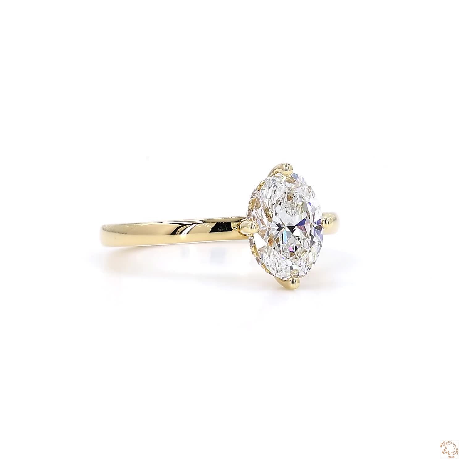 This elegant engagement ring features a lab-grown oval diamond, set in 18K yellow gold in rounded 4-claw setting. The diamond is beautifully complemented by a hidden halo of round brilliant lab-grown diamonds, which adds a touch of subtle sophistication. This engagement ring is perfect for adding a touch of understated luxury to any occasion and is designed to fit seamlessly with a variety of wedding rings, ensuring a flawless look.