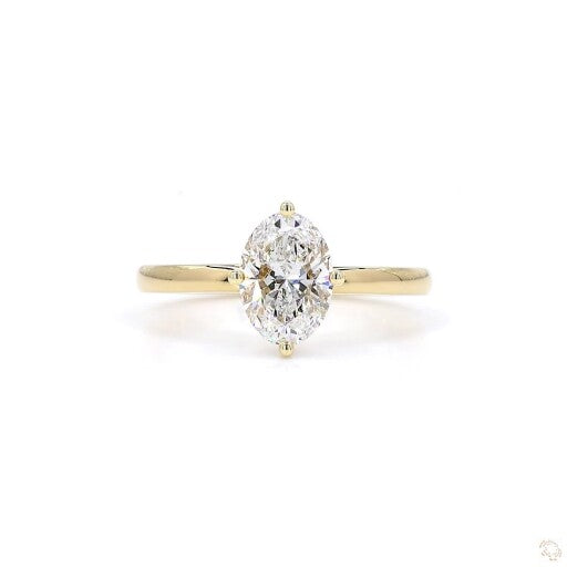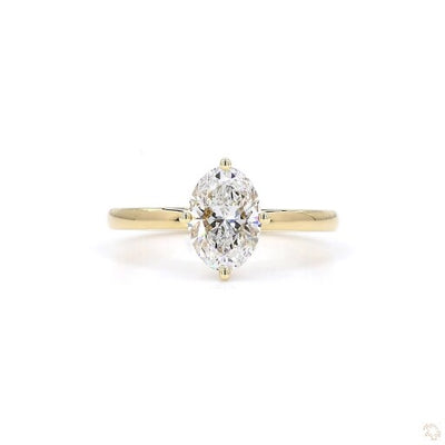 This elegant engagement ring features a lab-grown oval diamond, set in 18K yellow gold in rounded 4-claw setting. The diamond is beautifully complemented by a hidden halo of round brilliant lab-grown diamonds, which adds a touch of subtle sophistication. This engagement ring is perfect for adding a touch of understated luxury to any occasion and is designed to fit seamlessly with a variety of wedding rings, ensuring a flawless look.
