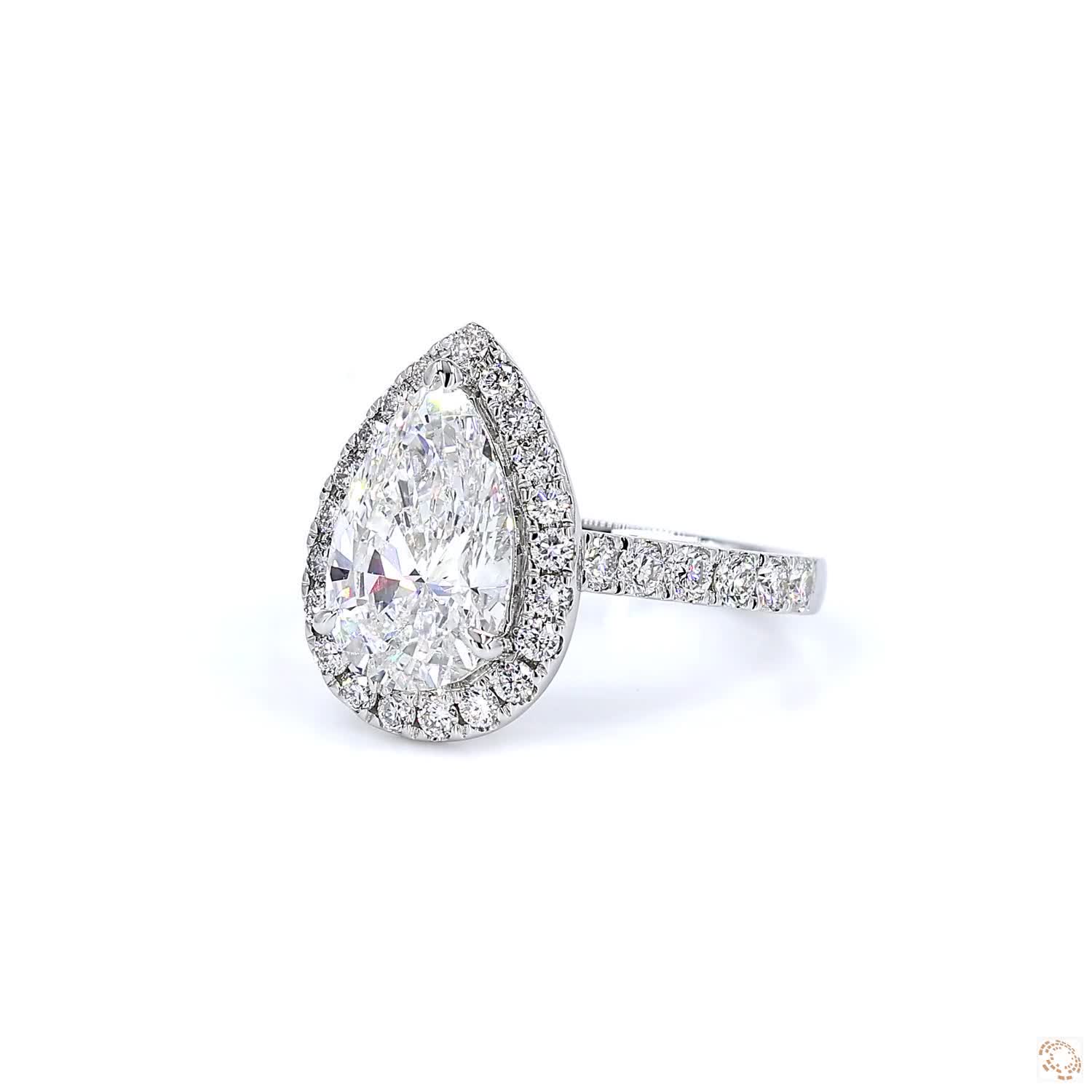 This elegant lab grown diamond ring features a 2.16 ct pear shape diamond surrounded by a halo of diamond of 0.60 total carat weight. Set in a cathedral setting with 18K White gold, this refined design is perfect for those who appreciate subtle sophistication and timeless elegance, making it an ideal choice for special occasions.