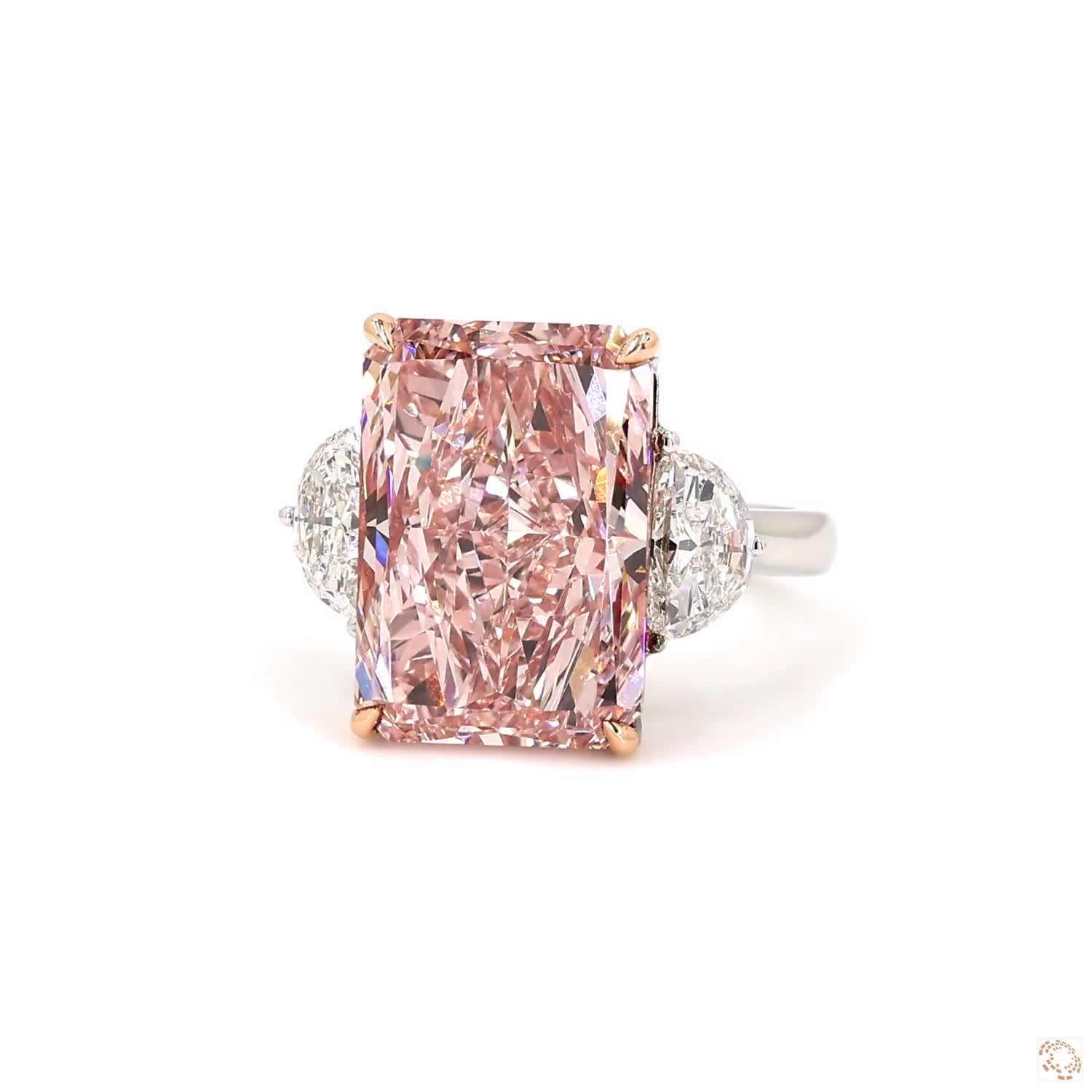 This exquisite three-stone diamond ring features a central radiant-shaped fancy orange-pink lab diamond of 8.39 carats, elegantly paired with two half-moon shaped white lab diamonds, each weighing 0.5 carats. This cocktail ring is perfect for those looking for a dash of elegance and color to any evening dress